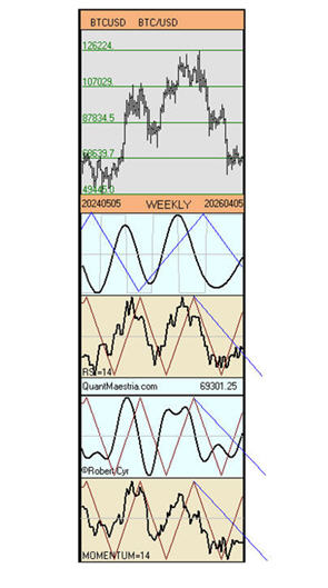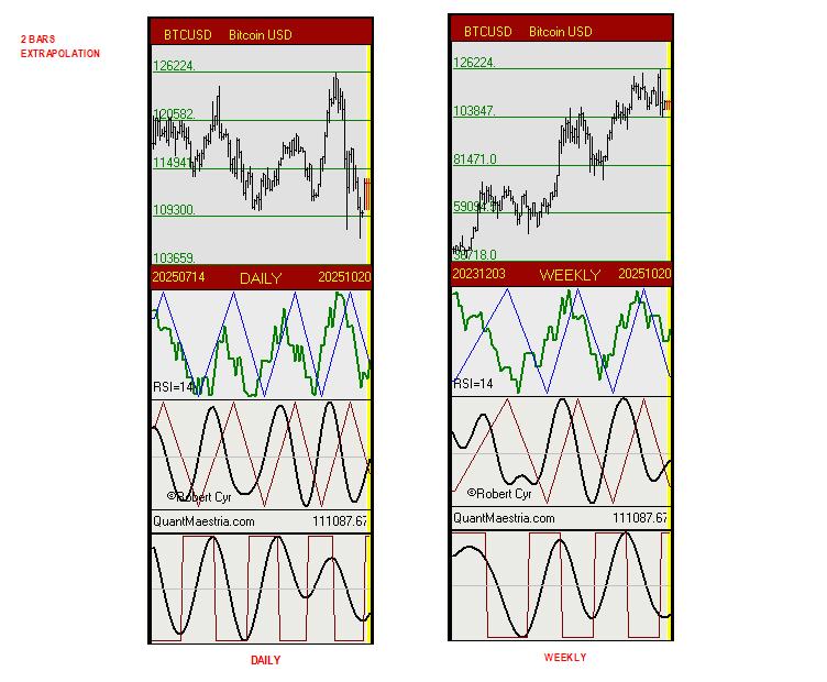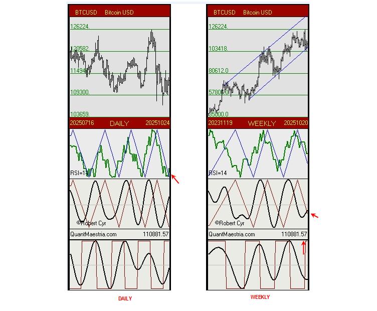 Here is an update of the cyclical indicators with a hypothetical close at 122,000, a gain of 12% in one week, on the daily and weekly charts.