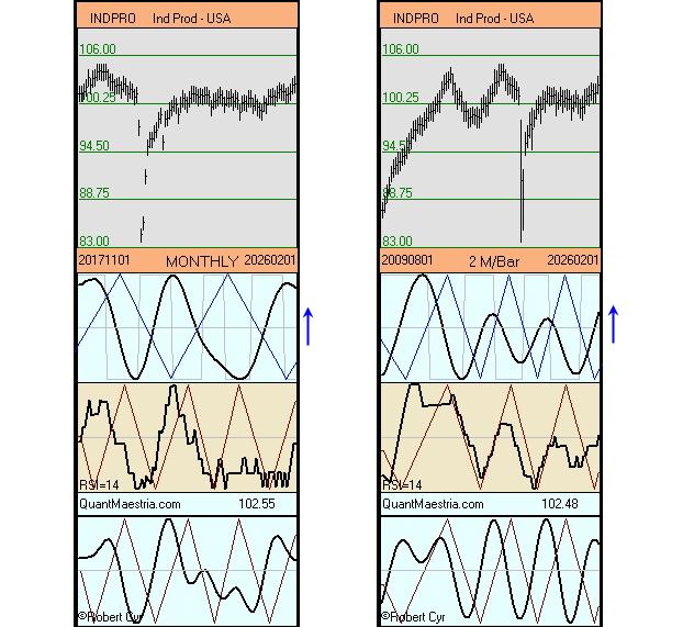 It is not possible to predict where the bottom will be, but based on the position of cyclical indicators, a cyclical turnaround is approaching on both graphs.